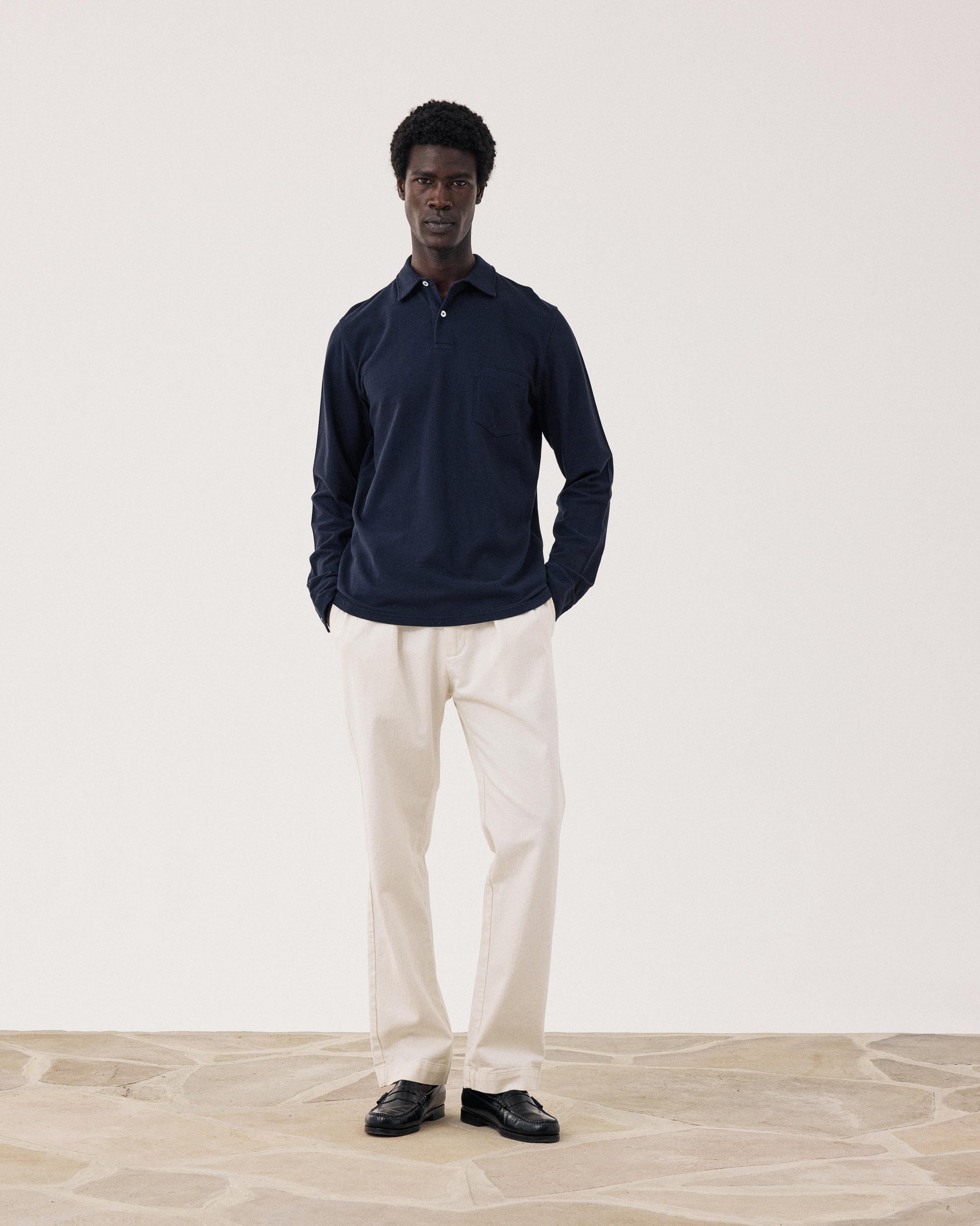 Polo homme en maille piquée à manches longues avec col à deux boutons, poche poitrine et poignets chemises ajustables.