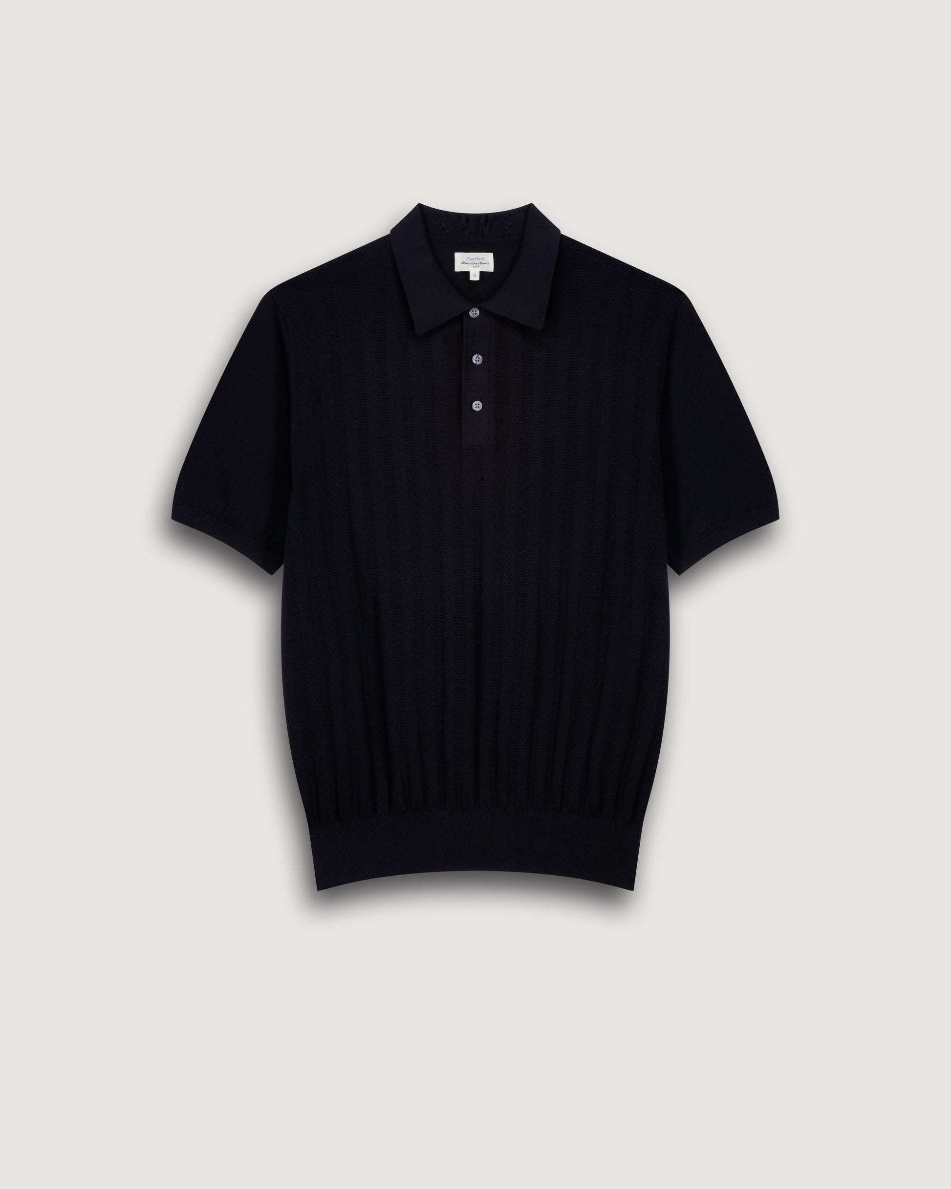 Polo homme en maille à manches courtes. Col à trois boutons. Bords-côtes au col, à la taille et aux manches.